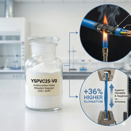 YSPVC25-V0 is a high-performance, eco-friendly, antimony-free flame retardant synergist designed specifically for flexible PVC applications. Based on advanced B-P synergy technology, it is engineered to fully replace Antimony Trioxide in PVC formulations.
